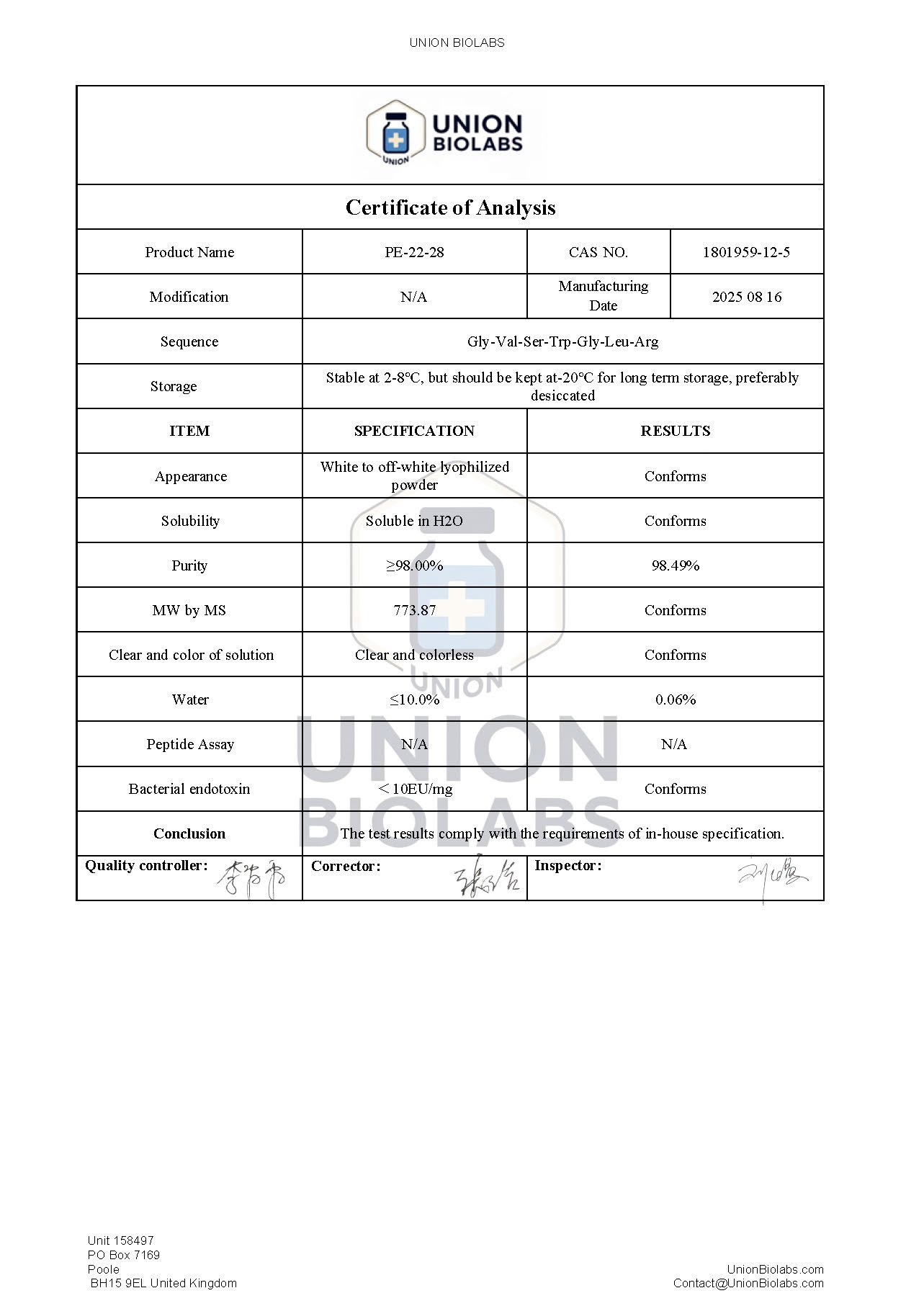 COA: Certificate of Analysis provided for each batch